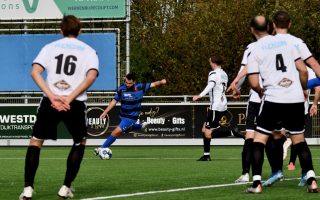De van een blessure teruggekeerde Lion van de Velde neemt zijn verantwoordelijkheid, legt de bal neer en schiet beheerst raak: 1-2 Olympia! (90+3’)